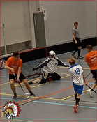 Kuvassa P16-joukkueen maalivahti Antti Koskela torjuu M5DIV-joukkueen maalivahtina nollapelin LASBia vastaan, Delfort Areenan kotiturnauksessa 29.10.2022. Samana päivänä Antin P16-kilpajoukkue oli jo pelannut omat pelinsä Akaa Areenalla. Kuva: Sari Tiitinen.