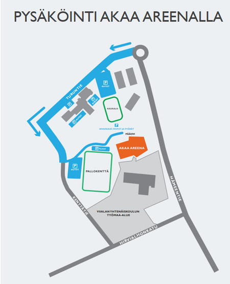 Areenan pihaan ei saa pysäköidä henkilöautoja! Pihassa sallittu ainoastaan invapysäköinti, mopot sekä polkupyörät. Henkilöautojen pysäköinti tapahtuu oheisen kuvan P-alueille, Turuntien puoleiselle parkkipaikalle (lätkäkaukalon ja siirtokoulujen vieressä) tai kenttätien puolelta pallokentän parkkialueelle.