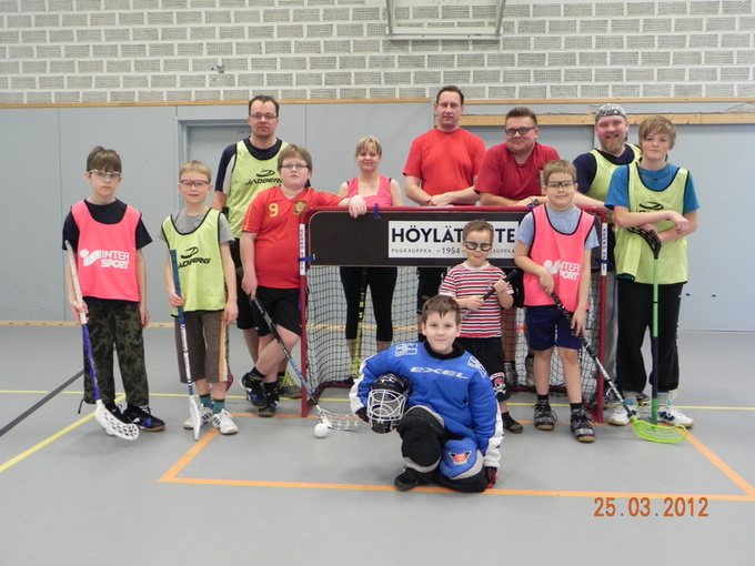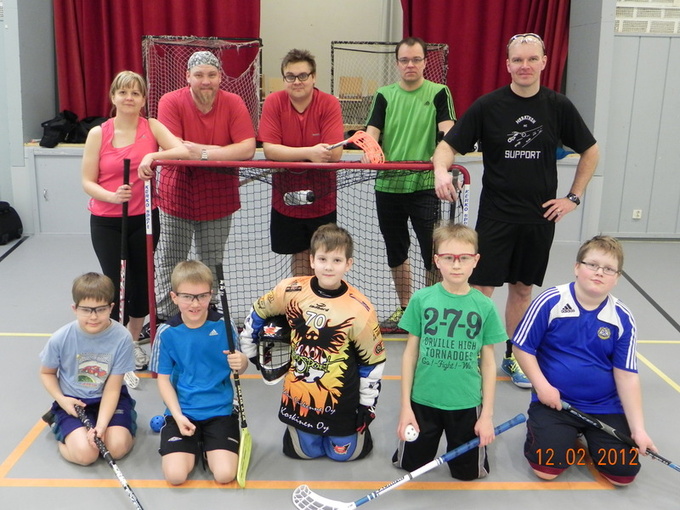 Tervakosken Aikuinen-lapsi -sählyäjät 25.3.2012: Takana vas.: Kristian Lehmussaari, Onni Kanervo, Matti Kanervo, Niko Oinonen, Jaana Miettinen, Teemu Lehmussaari, Janne Karhiaho, Janne Miettinen ja Waltter Ruohonen Maalin edessä vas.: Tino Miettinen, Joonas Karhiaho ja Jesse Karhiaho. |