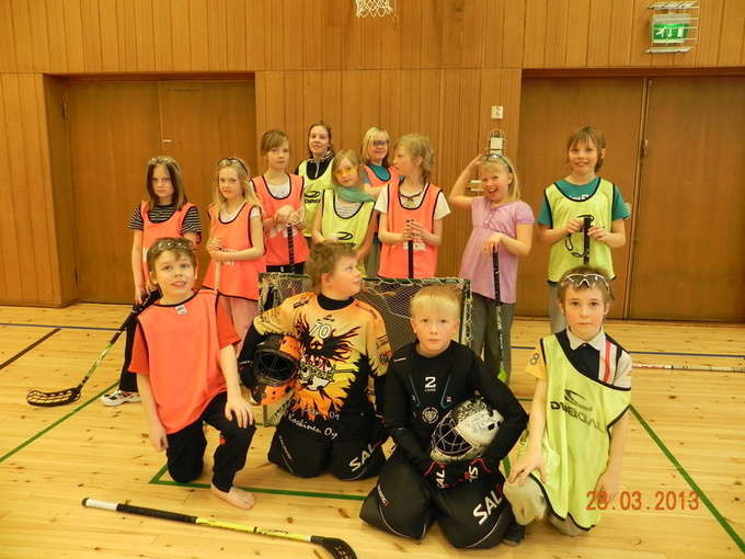 Turengin Perhesählykoululaiset 12.3.2013: Aikuiset takana vas.: Jonna Lehtonen, Satu Lappalainen ja Annakaisa Virtanen Lapset keskellä vas.: Julia Lappalainen, Johanna Haapanen, Väinö Virtanen, Hilma Virtanen ja Sari Heikkilä Maalivahdit edessä vas.: Vilho Virtanen ja Tuomas Toivonen |