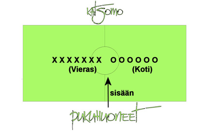 | Turnauskanslia | Turnauskanslia sijaitsee pelikentän laidalla, toimitsijapöydässä. Joukkueet kuittaavat sieltä saapuessaan pukuhuoneavaimen ja saavat pelaajalistaa vasyaan mukaansa turnauspaidat. Pukuhuoneavaimet palautetaan turnauksen jälkeen takaisin turnauskansliaan. Ennen avainten palautusta pukuhuone tulee olla siivottuna. Ylimääräisestä siivouksesta peritään maksu. Yhteyshenkilö turnauspäivän aikana: Petri Hakamäki, puh. 040 824 3727. | ||||||||||||||||||||||||||||||||||||